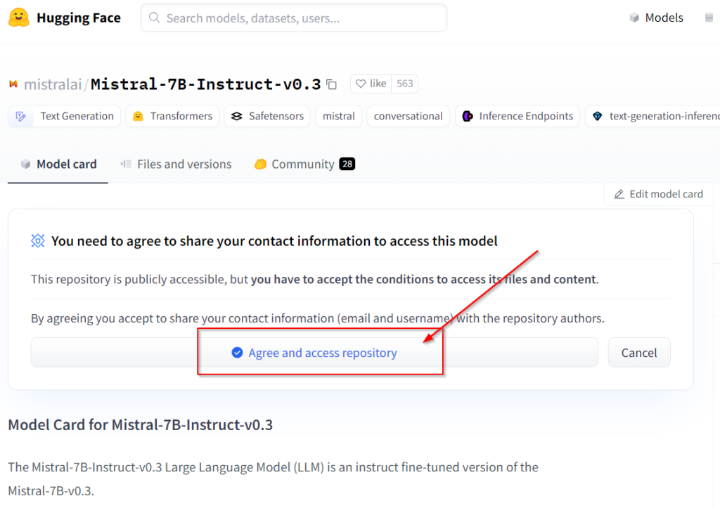 Once you have chosen your LLM and optionally fine-tuned it, it’s time to deploy it on the VM. If you get your LLM from Huggingface, you first need to generate the API key and accept the terms and conditions on the card for a given model before you can download it.